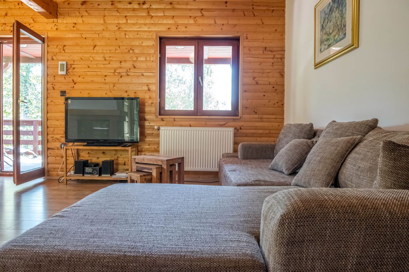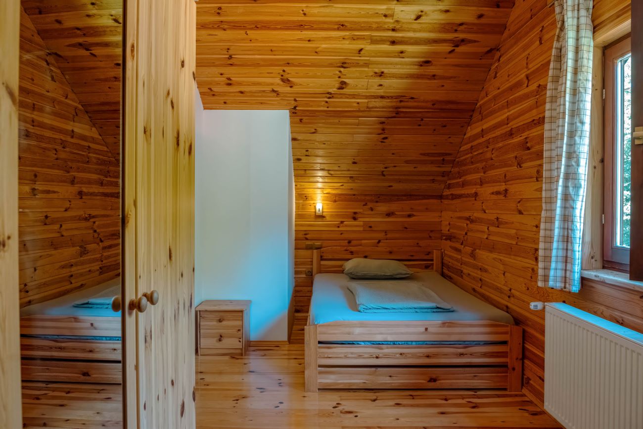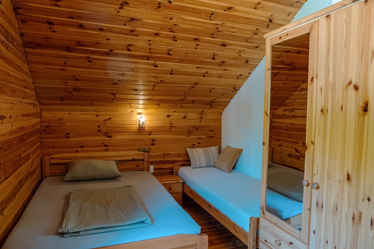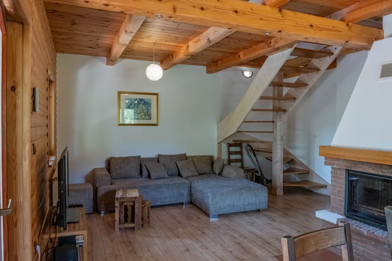 Dem Besucher stehen zwei Etagen zur Verfügung. Das Erdgeschoss verfügt über ein Wohnzimmer mit Essebereich und einer Sitzecke, die durch einfachen Umbau auch 2 Extrabetten beinhaltet. Weiters steht eine voll ausgestattete Küche bereit sowie ein einladendes Badezimmer mit Dusche. Der erste Stock verfügt über 3 Schlafzimmer ausgestattet mit Doppelbetten und einem Extrabett sowie einem Badezimmer. Eine große Terrasse lädt im Erdgeschoss zum Verweilen ein, während im Oberstock die Aussicht vom Balkon aus genossen werden kann. Jedes Haus ist über mit der Feuerstelle im Erdgeschoss verbundene Radiatoren leicht beheizbar. Geschützt direkt hinter dem Haus befindet sich ein offener Grill. Die Häuser eignen sich für 4 bis 9 Personen oder zwei Familien mit Kindern.